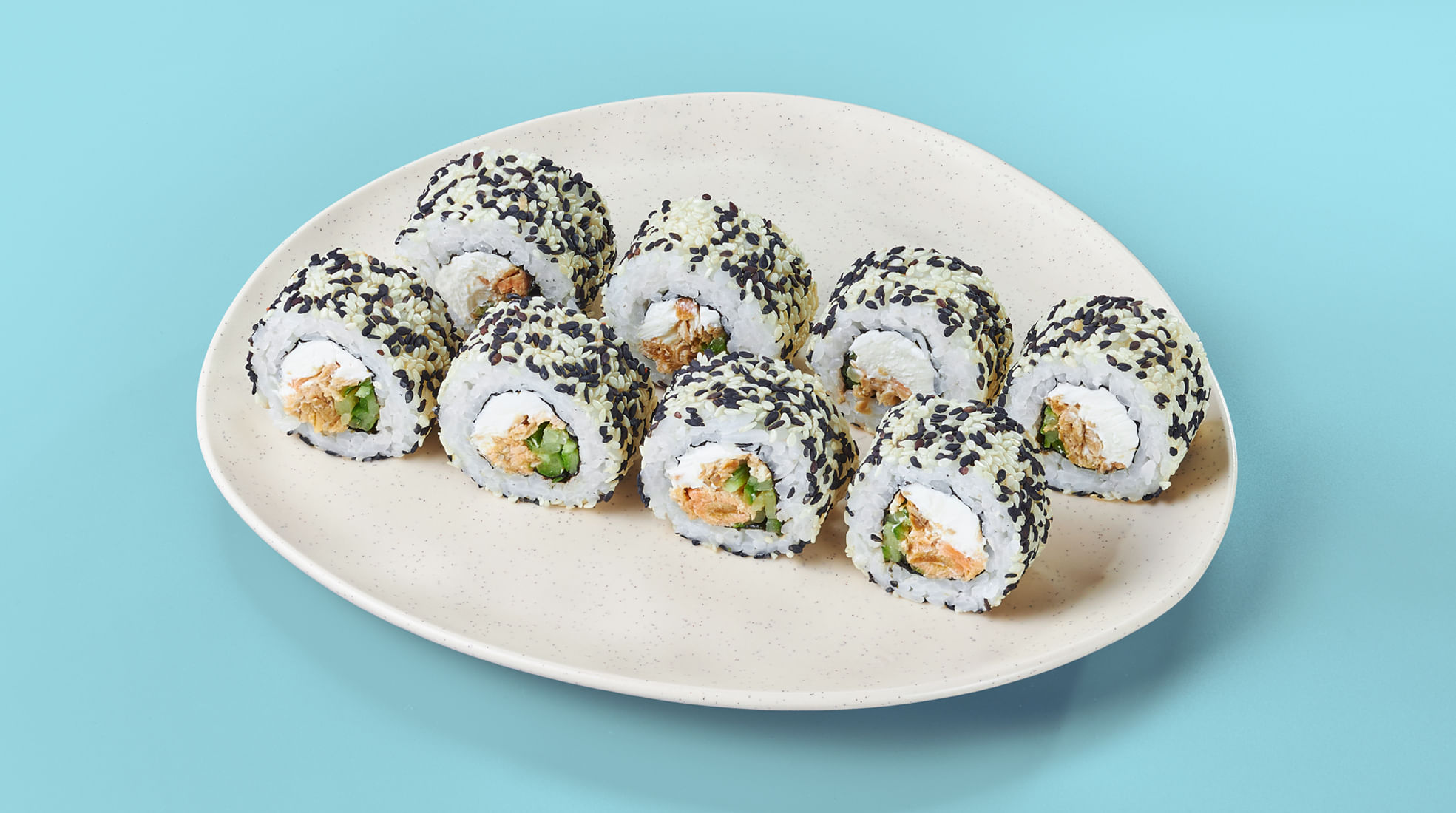 Сливочный сыр, огурец, оранжевая икра масаго, рис (рис, вода, заправка для риса), нори *Не забудьте заказать имбирь, васаби и соевый соус. Они не входят в стоимость заказа. *Внешний вид блюда может отличаться от фото на сайте