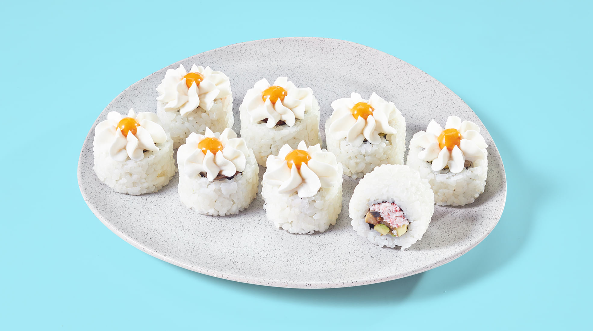 Крабовые палочки, фирменный сырный соус, рис, нори. *Не забудьте заказать имбирь, васаби и соевый соус. Они не входят в стоимость заказа. *Внешний вид блюда может отличаться от фото на сайте