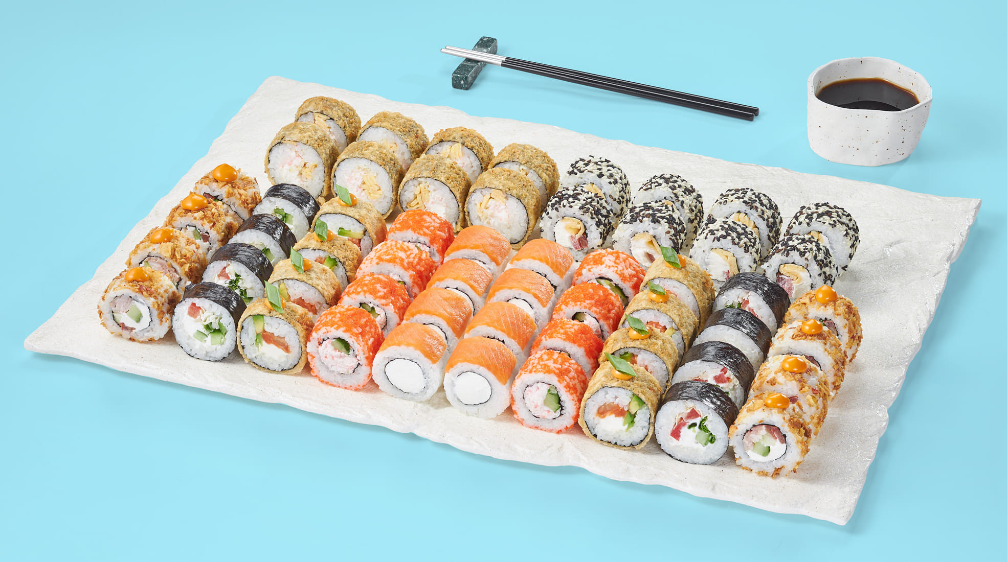 Ролл Филадельфия лайт (8 шт), ролл Калифорния супер лайт (8 шт), ролл Филадельфия в кунжуте (8 шт), ролл Бао (8 шт), ролл Спешл (8 шт), ролл Южный (8 шт), ролл Флай-скай (8 шт), ролл Нежный с курицей (8 шт), ролл Канада хот (8 шт). *Не забудьте заказать имбирь, васаби и соевый соус. Они не входят в стоимость заказа. *Внешний вид блюда может отличаться от фото на сайте